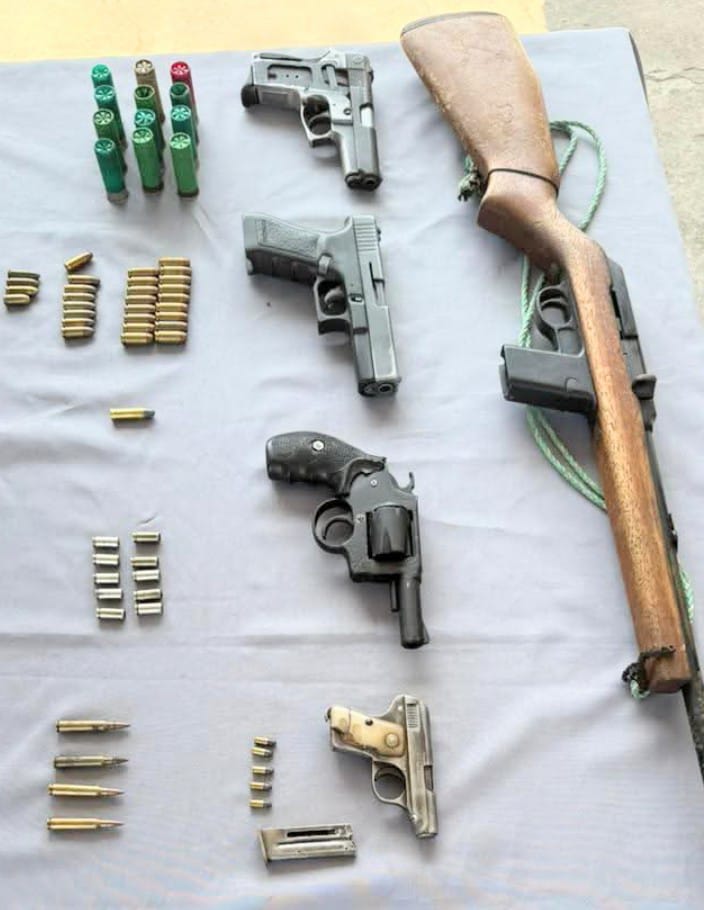 Los soldados del Ejército ecuatoriano en la ciudad de Machala, capital de la provincia de El Oro, el martes 17 de diciembre de 2024, detuvieron a dos ciudadanos por el presunto delito de tenencia y porte de 5 armas de fuego y varias municiones; ellos no tienen los permisos de tenencia y porte de esos artefactos.