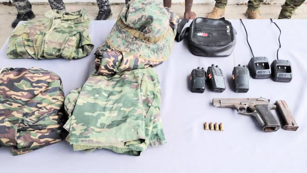 En el sector Las Katias, de la ciudad de Machala, capital del cantón de similar nombre, de la provincia de El Oro, los soldados de las Fuerzas Armadas detuvieron a un ciudadano y decomisaron un arma de fuego, 4 balas, 3 radios de comunicación y varias prendas militares.