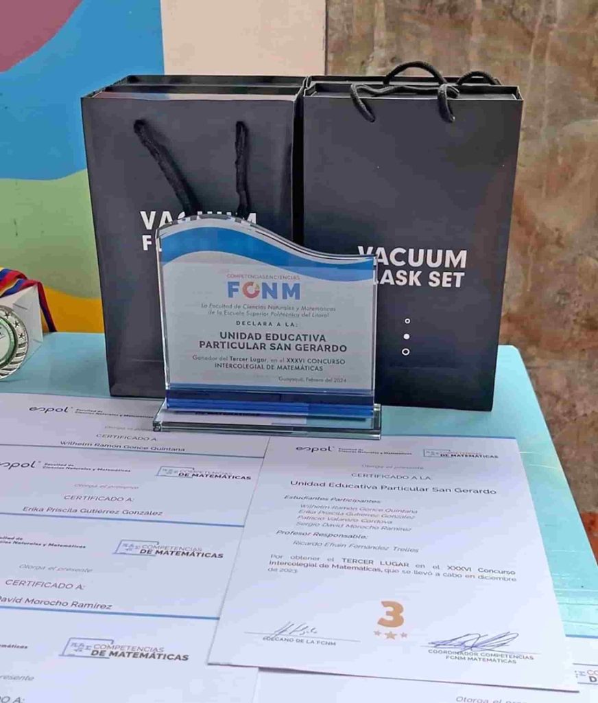 El equipo del San Gerardo obtuvo un meritorio tercer lugar en el XXXVI Concurso Intercolegial de Matemáticas, con la participación de los estudiantes Wilhelm Gonce, Erika Gutiérrez, Patricio Valarezo y Sergio Morocho.