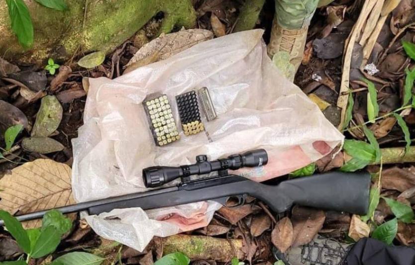 En el recinto Paraíso, de la parroquia Río Bonito, del cantón El Guabo, de la provincia de El Oro, el miércoles, 20 de noviembre de 2024, los militares decomisaron una subametralladora, un rifle, municiones, una mira telescópica y dinero. La persona que portaba esos instrumentos fue retenida y entregada a la Policía Nacional.